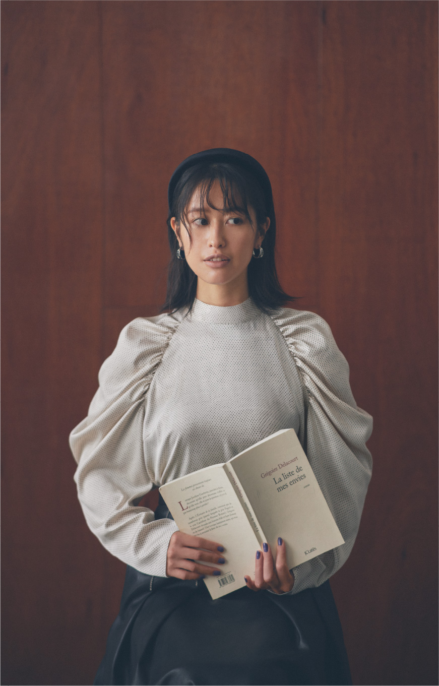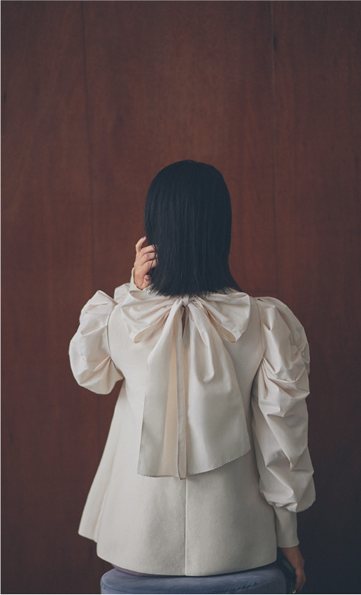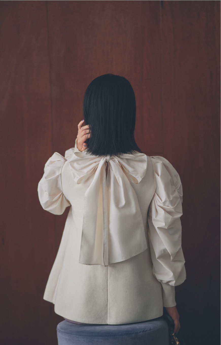 強めの印象になりがちなパワーショルダーのトップスが少し柔らかく見えるのは身頃だけニットで仕上げているから。袖やバックリボンのボリューム感が引き出すモードな雰囲気をニットが程よく和らげて大人なバランスにしてくれます。フレアでチュニック丈なので、パンツの日に気になるヒップやお腹周りを上手に隠せるのも嬉しいですね。