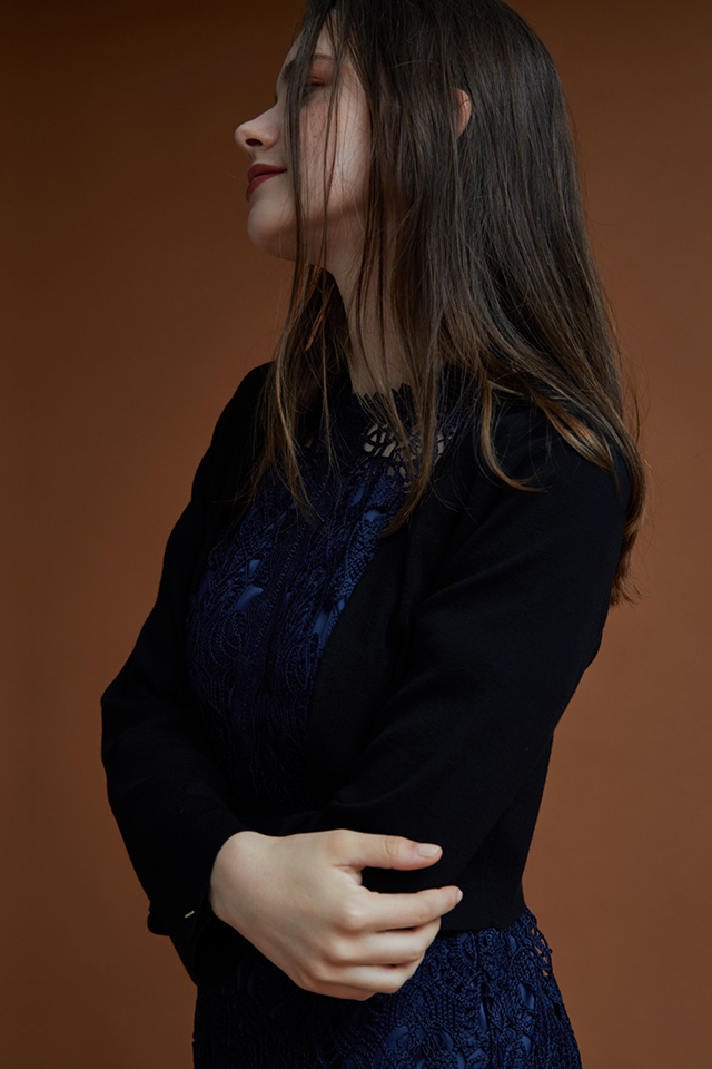 襟ぐり部分にはダイヤ柄モチーフのレースを使用し、