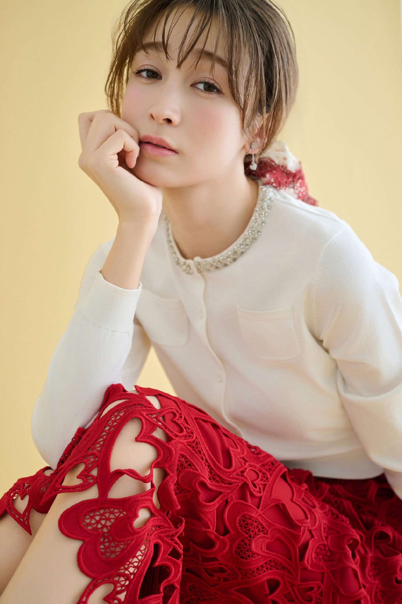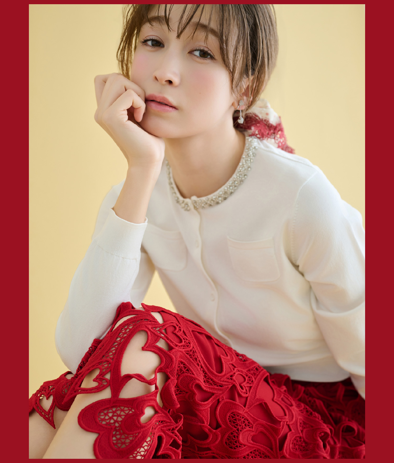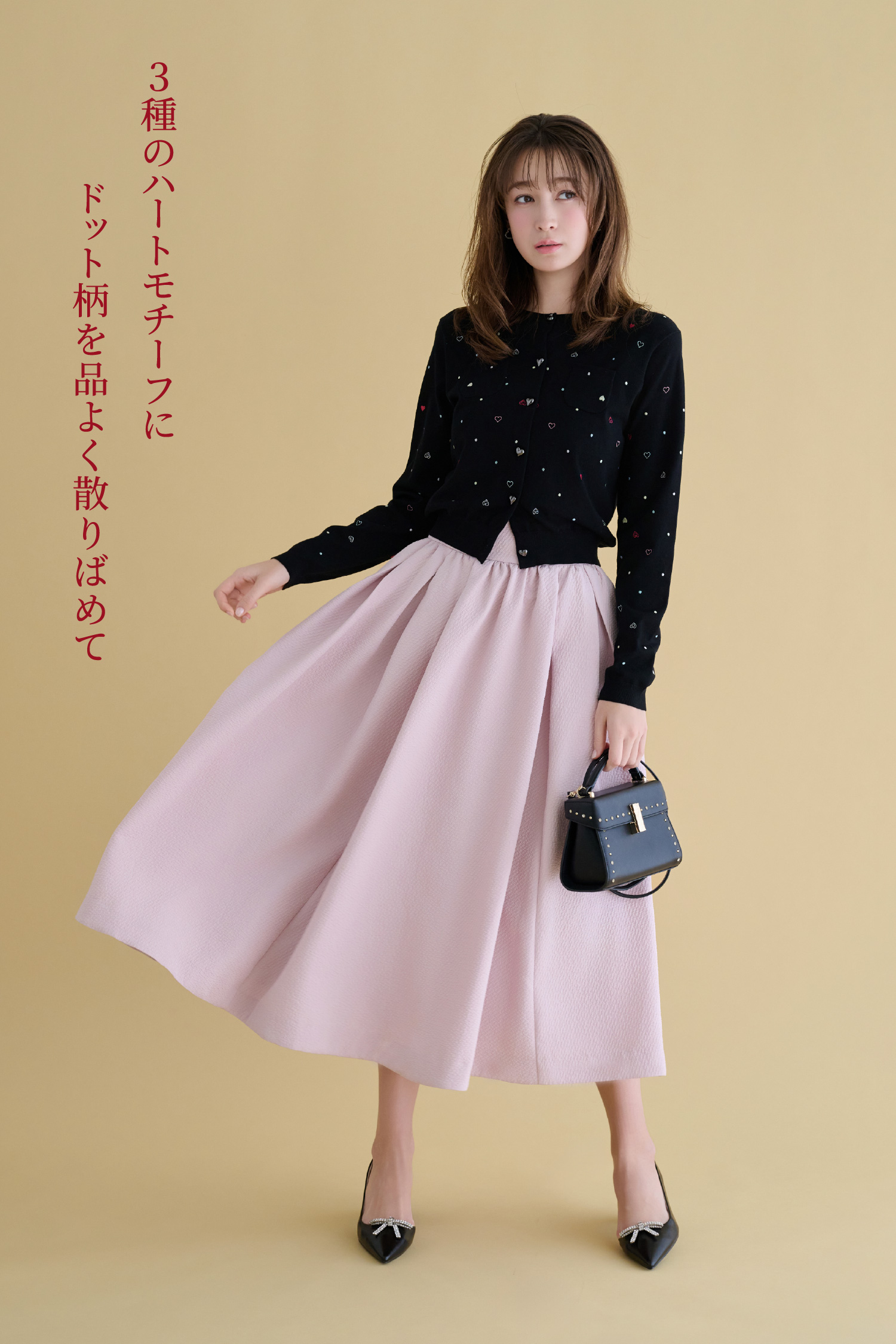 ハート刺繍を散りばめたカーディガンを主役に、 程よく大胆なボリュームスカートを合わせて、 印象は一気にモードへ。 フロントに並ぶハートボタンが、視線を集めるアクセントに。
