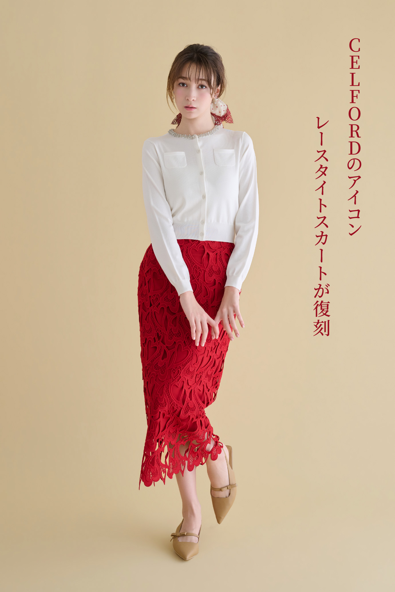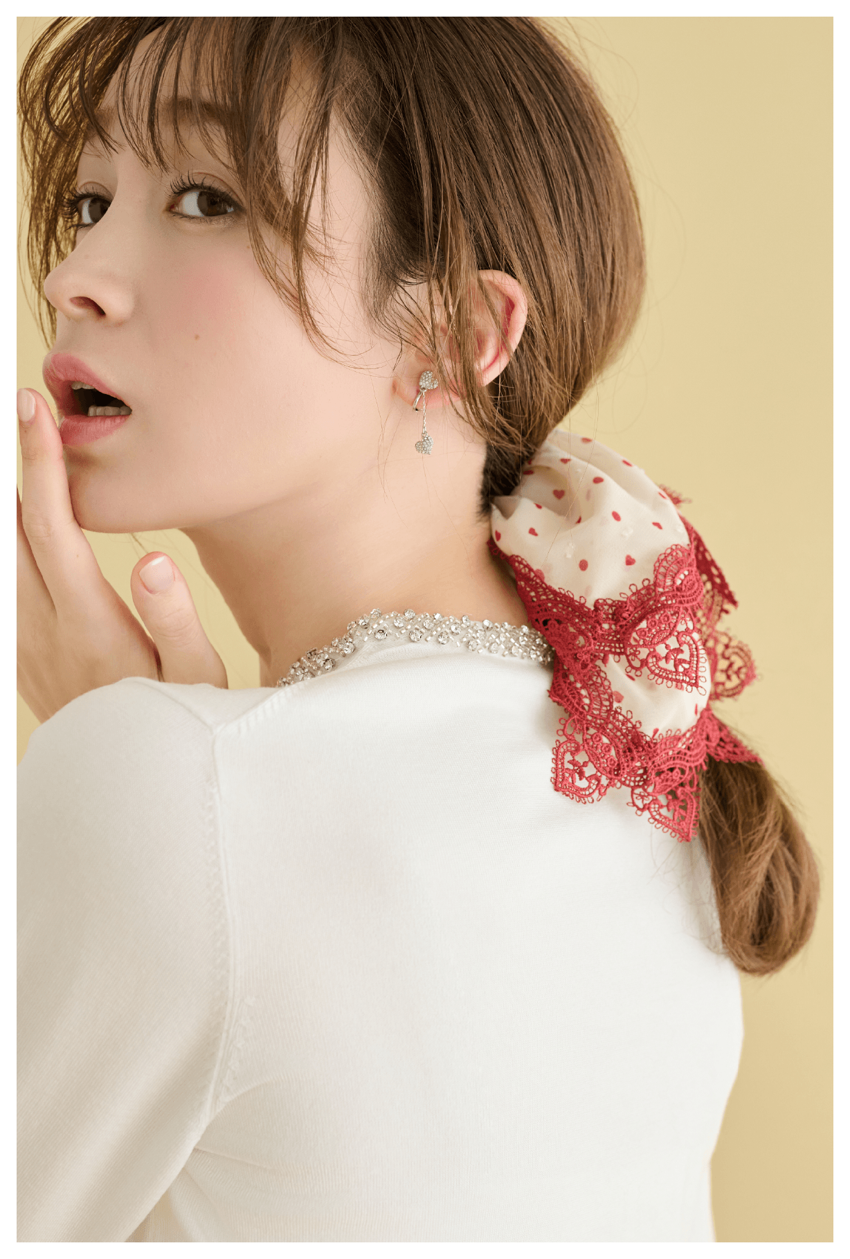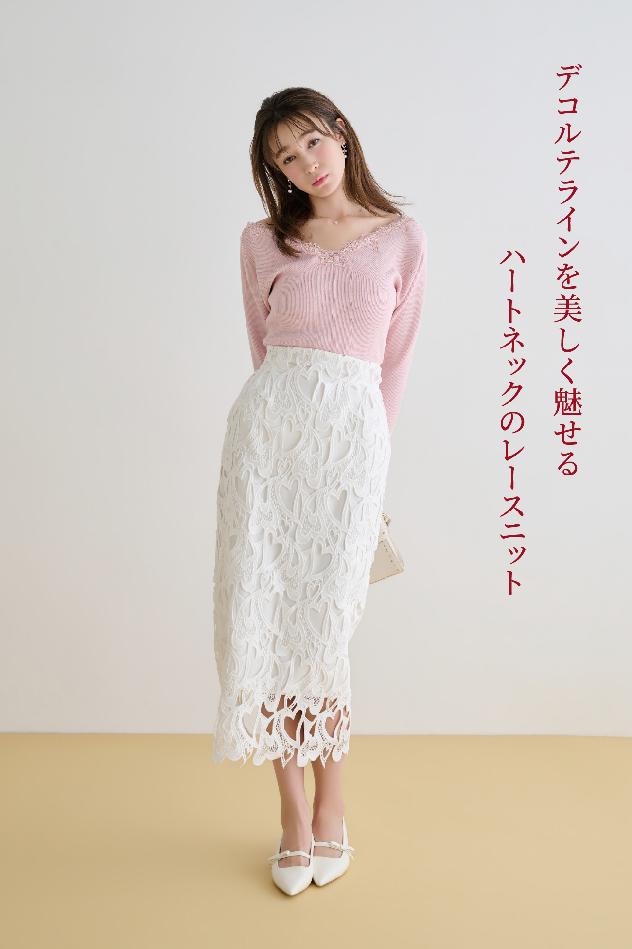 オリジナルのハート柄は、抜け感と繊細さを計算。 歩くたびに表情を変えるヘムラインが、 装いに奥行きを与えます。 ビジュー付きカーディガンを合わせて、 アクセサリーに頼らない完成度へ。
