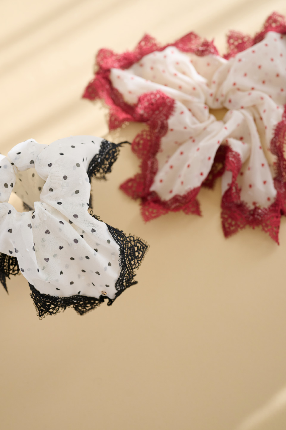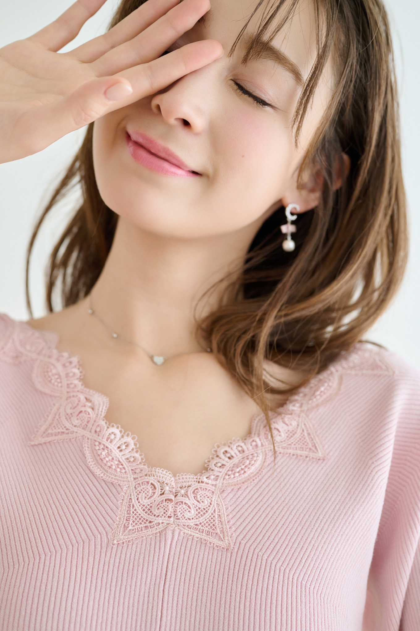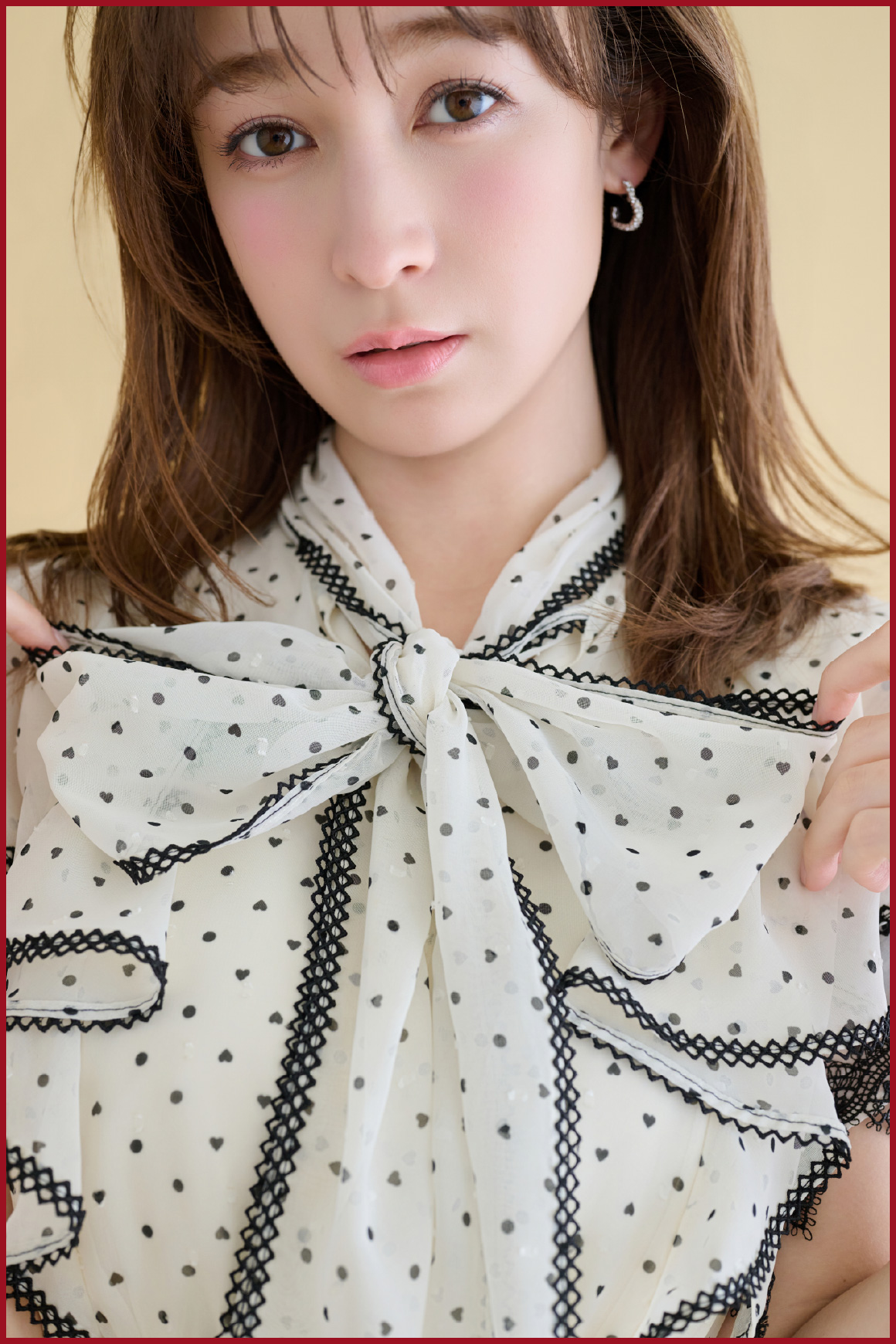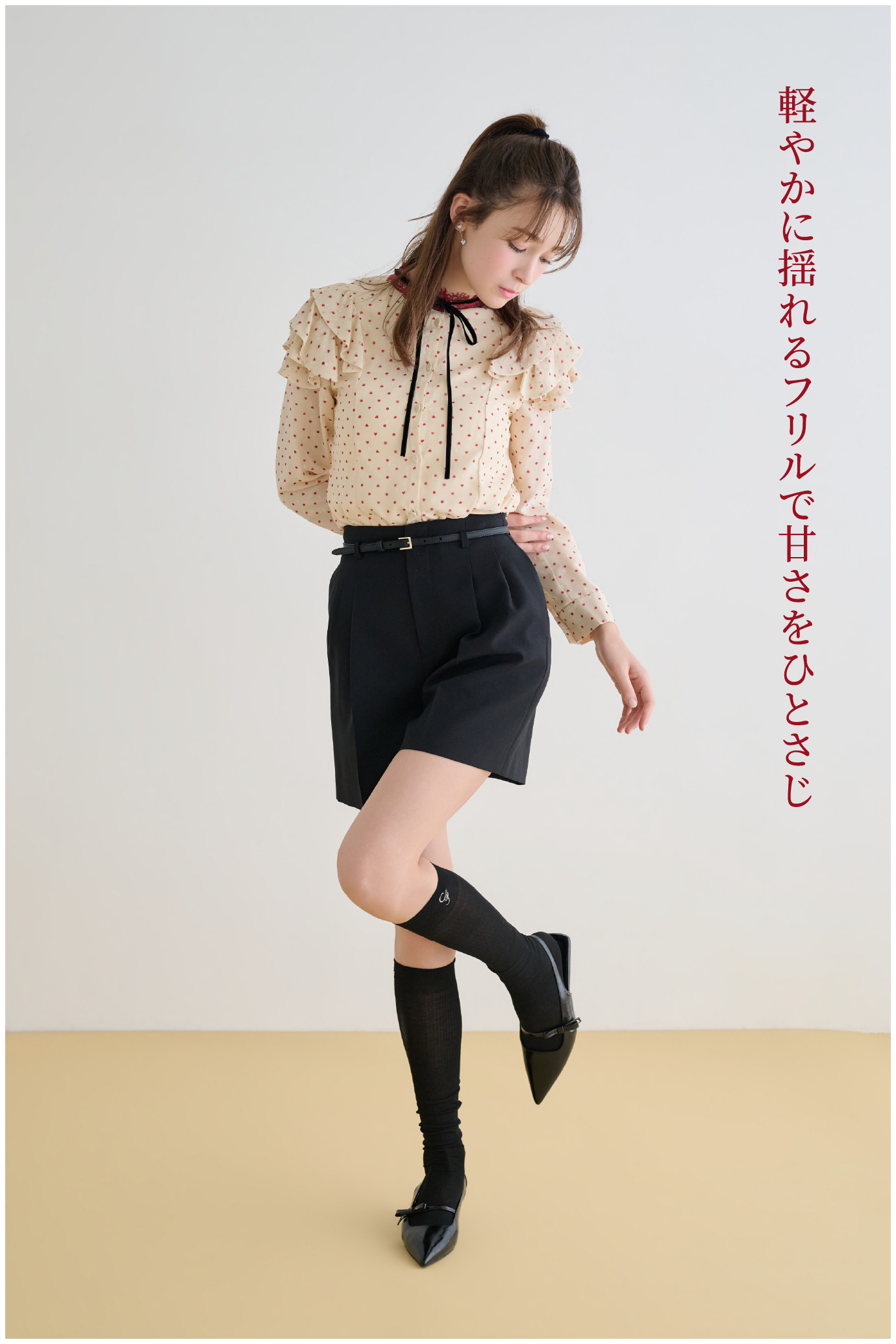 バレンタインシーズンに映える ショルダーフリルが印象的なブラウス。 衿ぐりには、ハートモチーフを忍ばせた テープレースをあしらい、近くでこそ伝わる遊び心を。