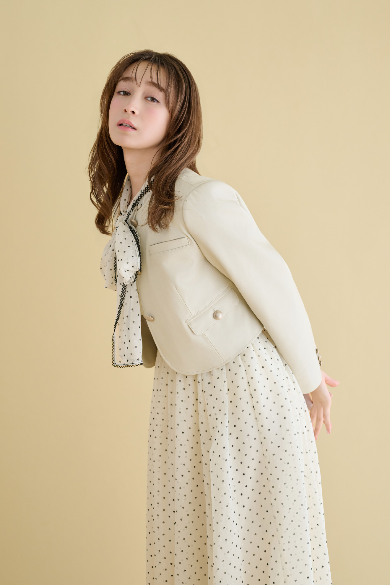 トレンドのポルカドットに、ハートを織り交ぜたプリント。 視線を惹きつけながらも、大きさを抑えたドットが 着こなしやすさを叶えます。 レザーライクジャケット合わせで、デイリーにも映える一着に。