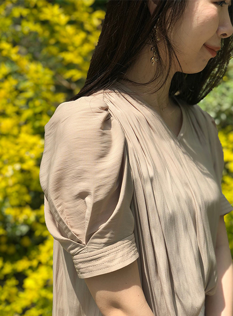 V字形にすっきりと開いたネックが大人っぽく見せるポイント。袖にふんわりと膨らみを持たせた、フェミニンムード漂うアイテムです。