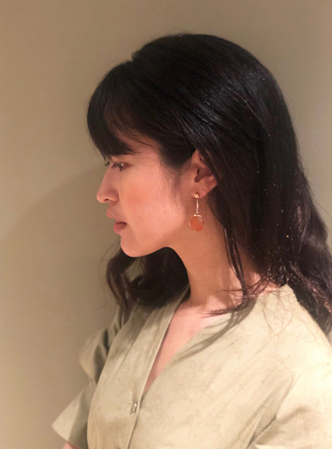 ミステリアスなカラーで耳元を雰囲気良く彩るメノウピアス。シックにまとめた着こなしのハズシにも活躍。