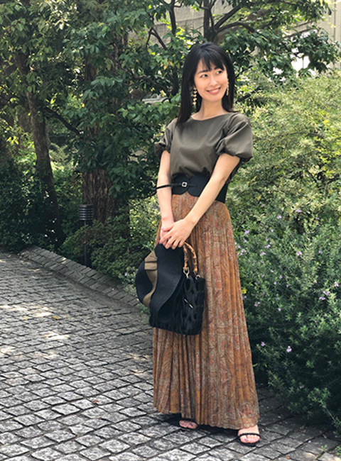 ロング丈のエレガントなデザインで、大人の女性らしさを感じさせるパネルプリントスカート。シンプルなTシャツが横に広く開いたネックが顔周りをすっきりと見せてくれます。