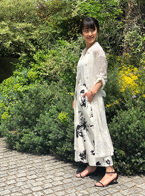 シャツワンピースのような軽やかさで、さらっと羽織れるレースコート。華やかなシャンタン素材で作られたワイドパンツをクロップド丈に仕上げることで、足元にヌケ感をプラスしました。