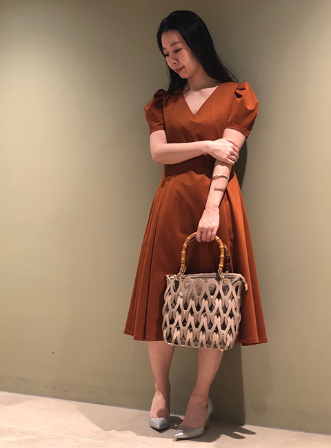 キュッとウエストシェイプされ、美しさが引き立つAラインシルエットを描く女性らしいワンピース。ざっくりとしたデザインカットが印象深いトートバッグがクラシカルな雰囲気に。