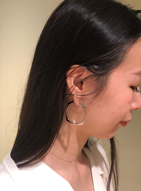 やや丸みを帯びたスクエアのフレームが、品の良い印象のピアス。内側に小ぶりのパールパーツを添えて、フェミニンなエッセンスも効かせています。フロントだけでなくサイドやバックからの表情も抜かりなく決まる逸品。