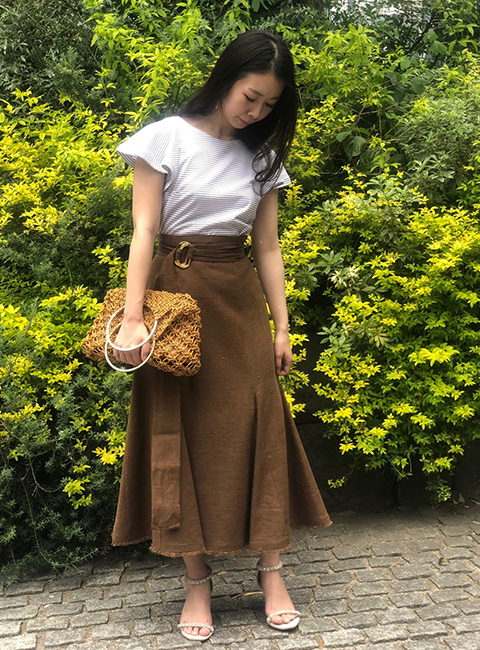 裾にふわりと広がりを持たせた、マーメイドラインの女性らしいスカート。ふんわりと立体感のあるトップスをボトムにインにして、綺麗めな印象に。