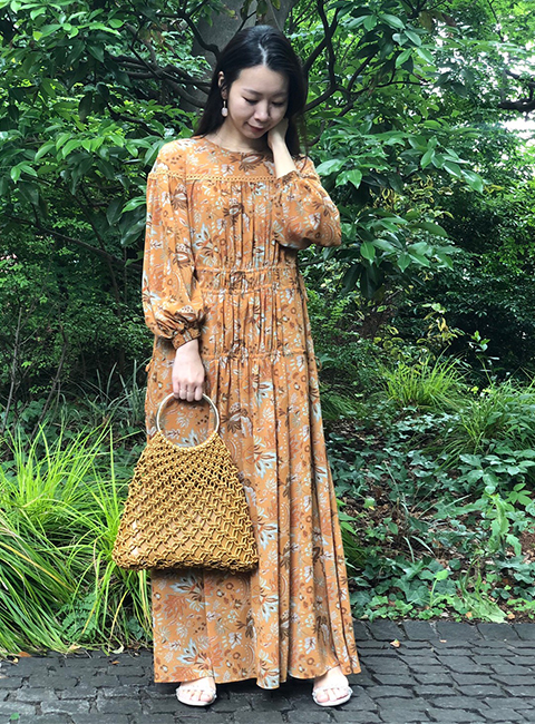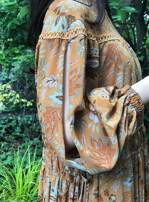 レープを強調したシルエットや、素肌がちらりと覗くスリット入りの袖など、キトンを彷彿とさせるデザインが印象的です。落ち着いた色合いのボタニカル柄で、甘いイメージになり過ぎないのもポイント。