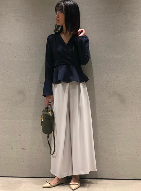 カシュクールにペプラムをプラスさせた、フェミニンムードたっぷりのブラウス。ラップ風のフロントデザインのワイドパンツがレディな雰囲気に。