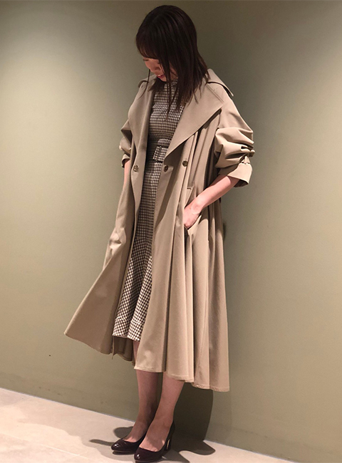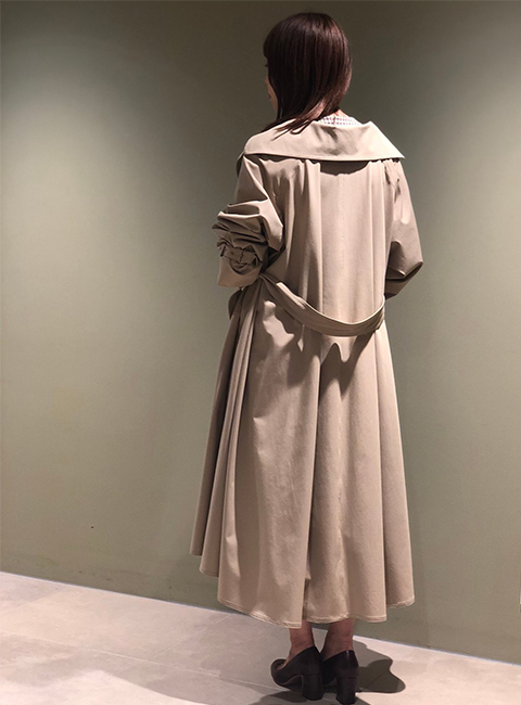 柔らかな素材で女性らしい表情を見せるトレンチコート。全体的にボリュームのあるシルエットで、ヌケ感のある雰囲気を漂わせます。