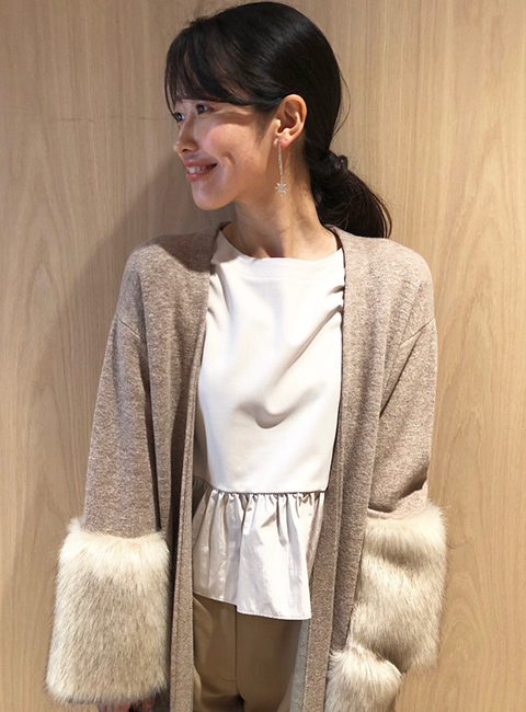 ファーモチーフをあしらった長めの着丈でゆるっとルーズに羽織れるニットガウン。きちんと感のあるテーパードパンツですっきりとした着こなすがおすすめです。