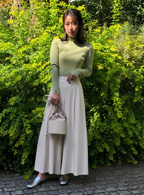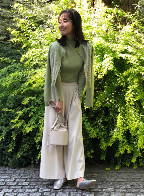 レースがエレガントなカーディガンは、同色ニットの肩掛けにしてさらりと取り入れるのがおすすめ。