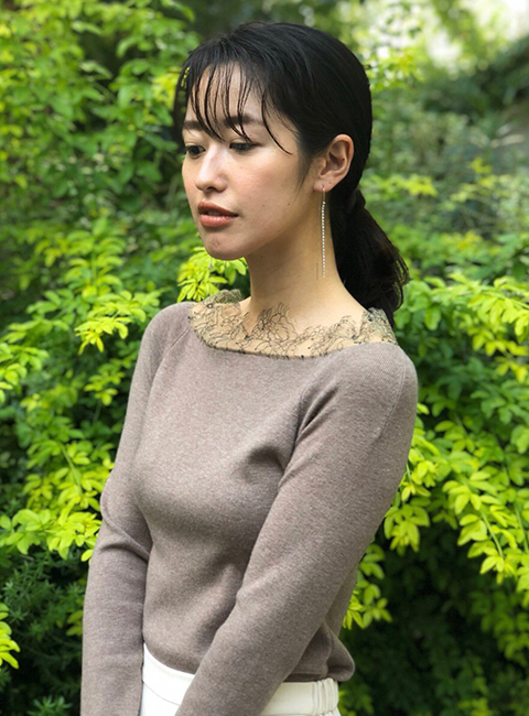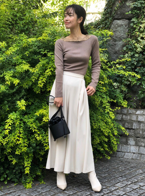 襟ぐりレースが女性らしいニットプルオーバー。裾を揺れるボトムにインして、すっきりと着こなすのが気分。