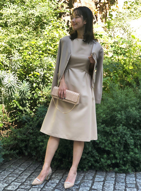 フィット&フレアのシルエットが女性らしく美しいワンピース。小物はワントーンでまとめた中にレースやビジューの輝きが映えます。