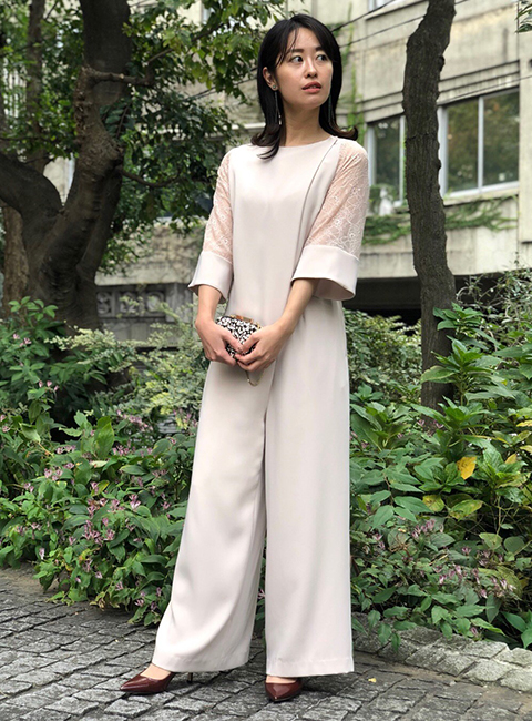 部分的なレース使いや、手元がすっきり見える袖丈で、女性らしい抜け感を演出。ビジューな小物が映える一枚です。