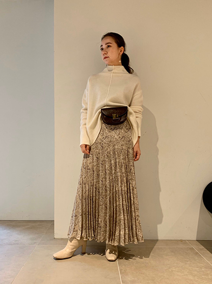 ウールカシミヤのニットは程よくルーズで、綺麗にきこなせます。表情豊かに揺れるプリーツスカートをあわせて、歩く姿も華やかに。