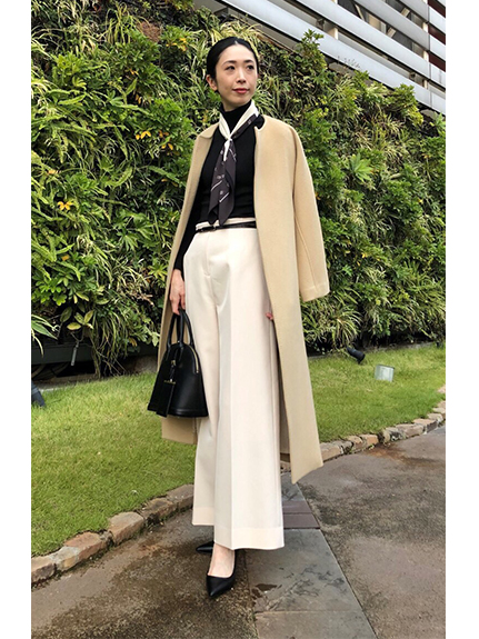 颯爽としたパンツスタイルに、馴染みのよいコートを羽織って。カシミア100%で、上質な素材感なので、シーンを選ばずに着まわせる優秀なコートです。
