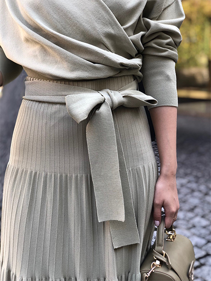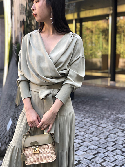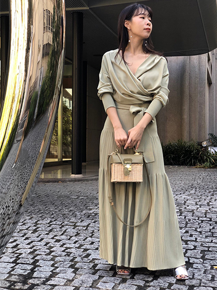 デコルテラインが美しいカシュクールと、ティアードシルエットのスカートを、セットアップでニットワンピースのように着こなしました。