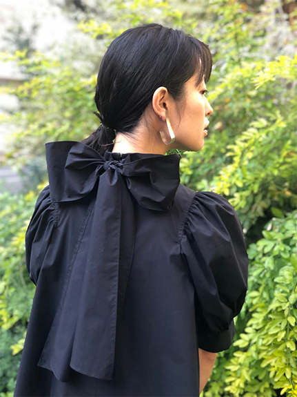 存在感を放つリボンが後姿美人をつくるブラウス。モードな雰囲気に、春らしいサックスブルーを差して軽快さを忘れずに。