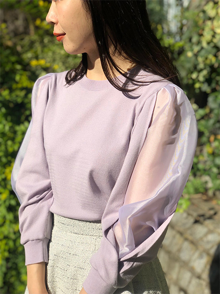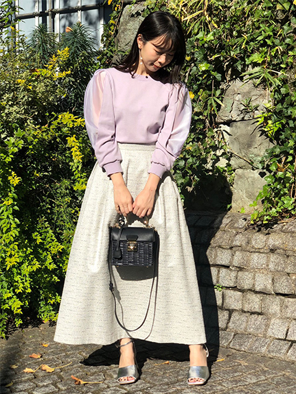 袖のスリットのシアー生地から、やわらかに肌が透けて覗くプルオーバー。ハリと光沢のあるスカートに合わせて、甘すぎない着こなしにしました。