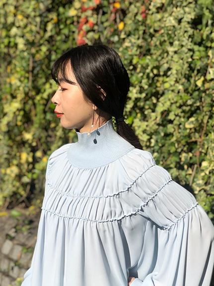シャーリングとフレアシルエットが女性らしさを引き立てるトップス。 ボリュームスリーブを絞ったリボンが、手もとを華やかに演出します。