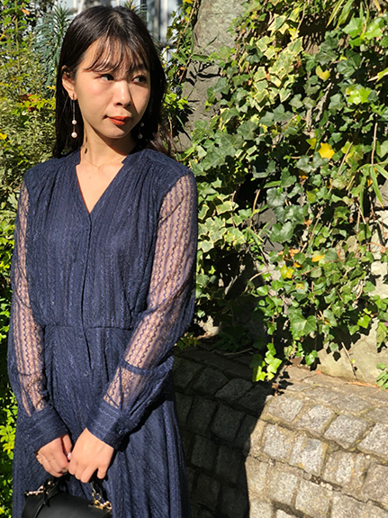 甘さと清潔感を併せ持ったストライプ状のワンピース。透け感のある袖で、軽やかな印象をつくります。