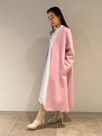 ロングコートは1枚で華やかな印象に。シャツワンピースとのコーデなら春らしいスタイルの出来上がり。