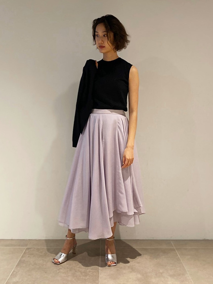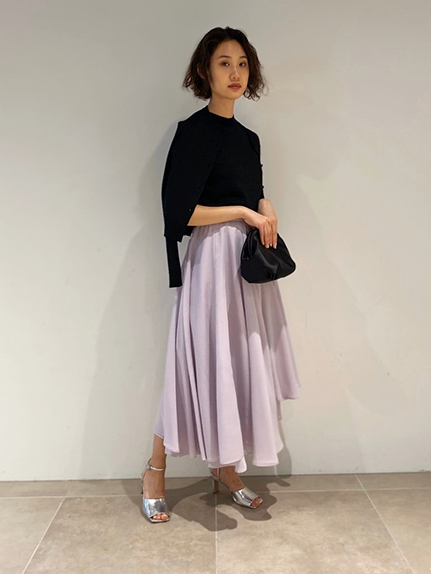 ボリュームシルエットがステキなスカートは、すっきりとしたトップスでバランスよくコーディネート。ブラックで合わせれば大人っぽいコーディネートの完成です。