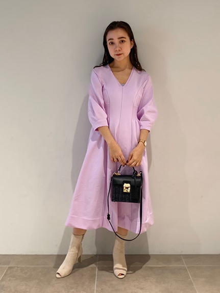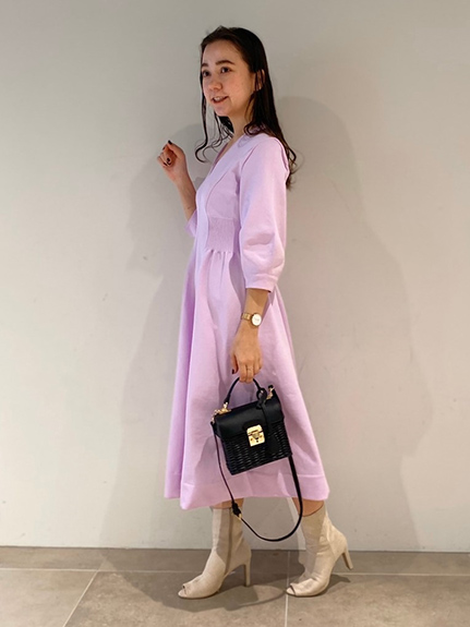 理想的なシルエットをつくる、ホールガーメントワンピース。Vネックですっきりと着こなせます。ブラックのバックをスパイスにしました。