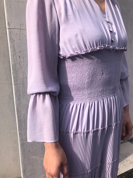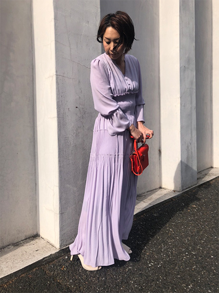 ワンピースの細やかなシャーリング使いが優雅さを演出してくれます。ビビットなカラーの小物で、きゅっと全体を引き締め。