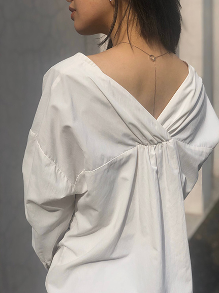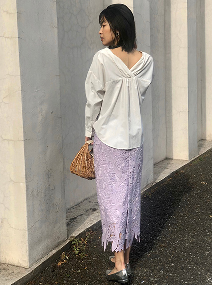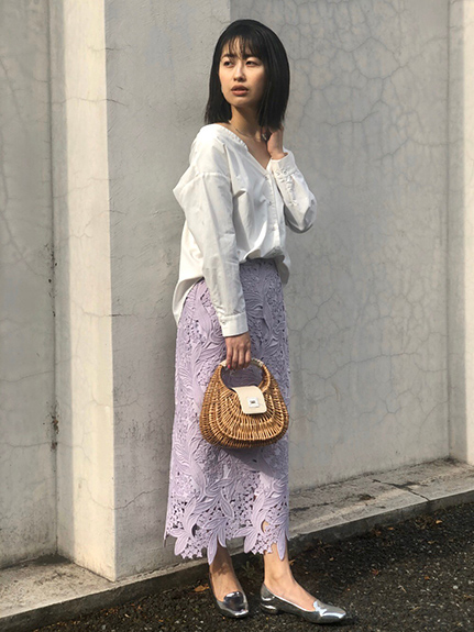デコルテラインを美しく見せてくれるブラウス。 バックカシュクールで後ろ姿の抜けも上品です。 ラベンダー色のスカートで春らしく。