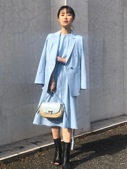 ワンピース+ジャケットのセットアップで、洗練された雰囲気のコーディネート。さわやかなサックスカラーには、ブラックのシューズをスパイスに。