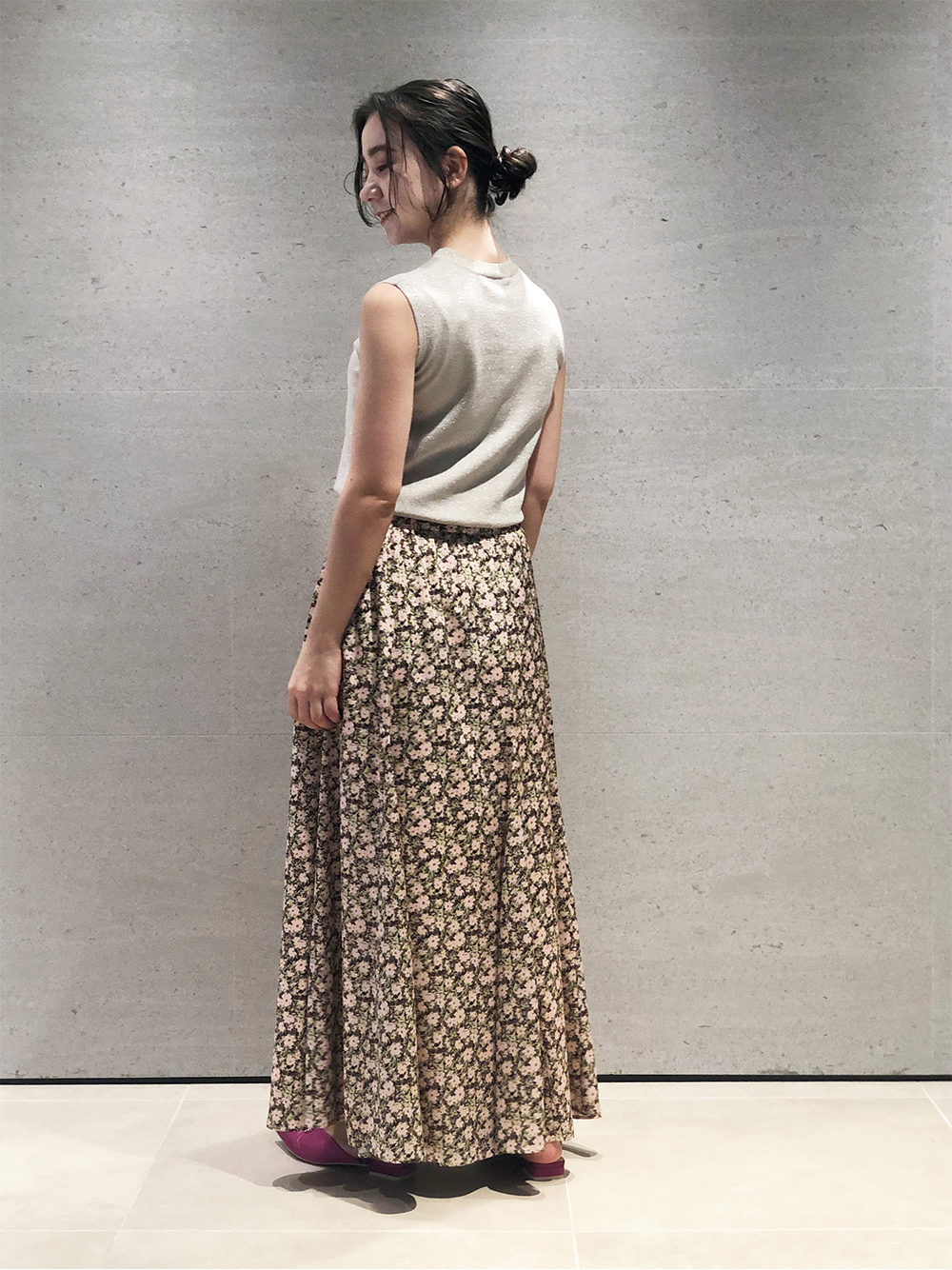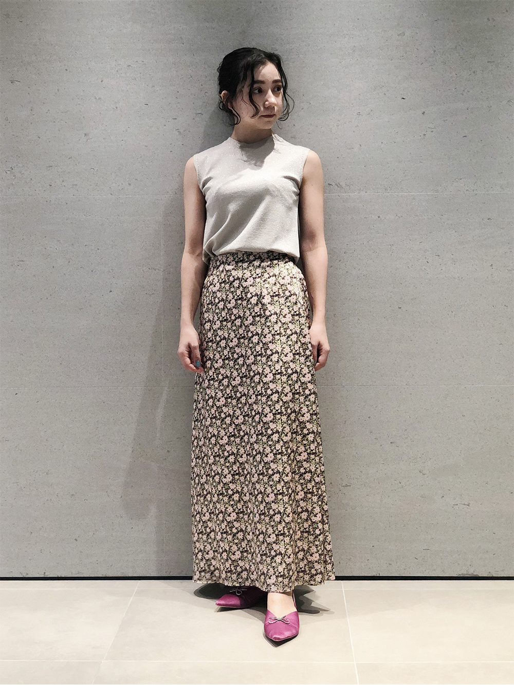 ラメ感が顔回りを華やかに見せてくれるニットプルオーバーは、はじめて会う人が多い春の時期に重宝するアイテム。上品な小花柄のスカートで好感度もアップ。