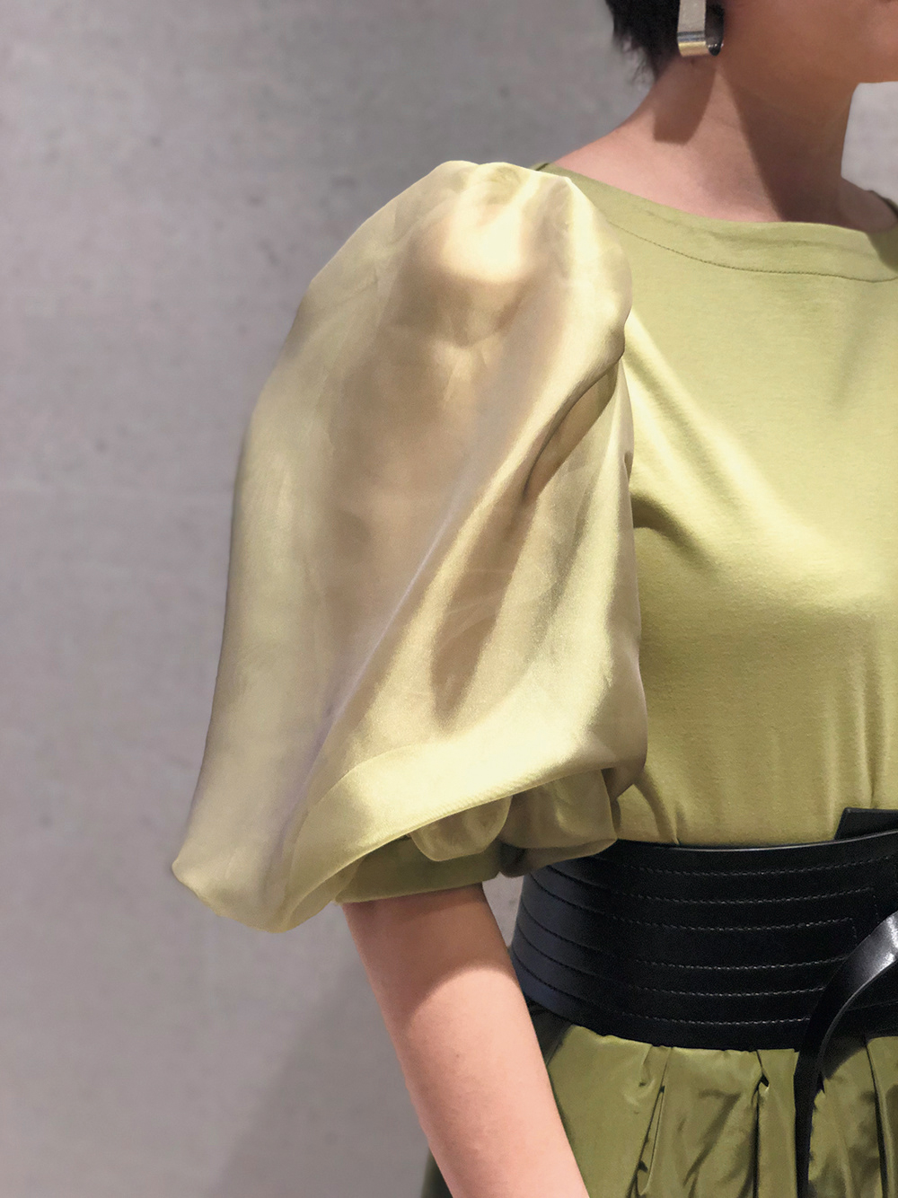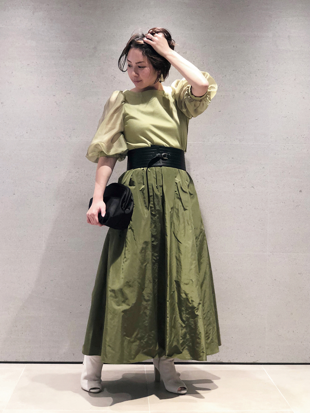 上品な光沢感のトップスとスカートを纏って、大人のエレガンス漂うスタイル。スカートのウエスト後ろはゴム使用、トップスはカットソー素材で伸縮性もあり、着心地も快適です。
