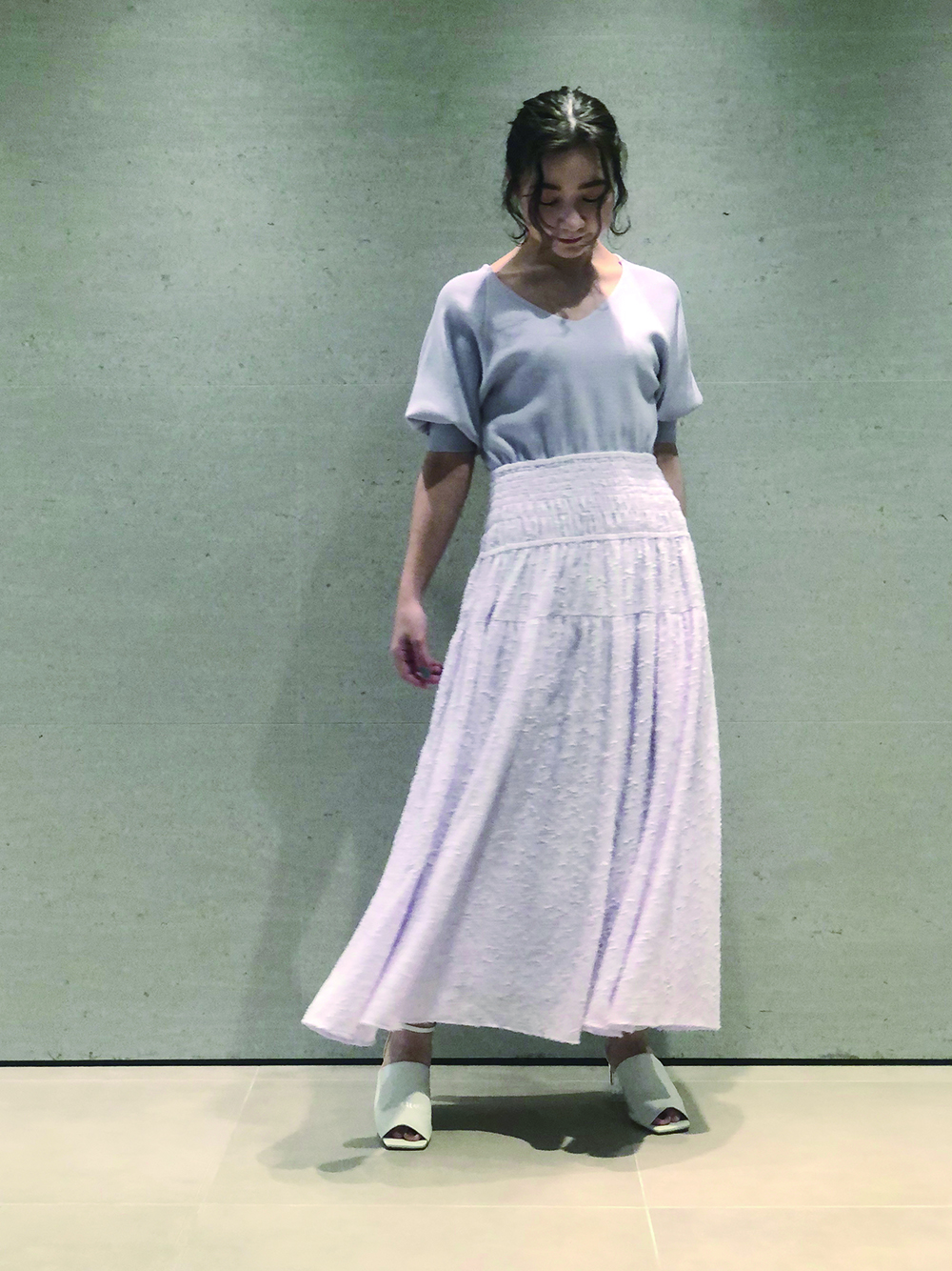 ふんわりした袖や、表面感のあるジャガードが、女性らしさを引き立てます。シューズもホワイトで、淡くトーンを合わせて春らしく。