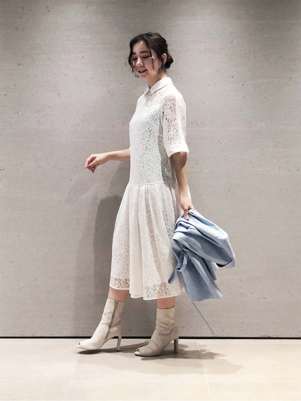 白の襟付きのワンピースに、ジャケットを羽織って清潔感ある着こなしに仕上げました。ペイズリー柄のレースのワンピースは、袖を通すと気分も上がります。