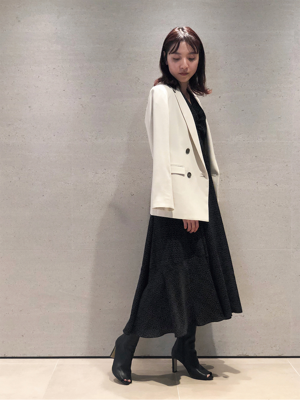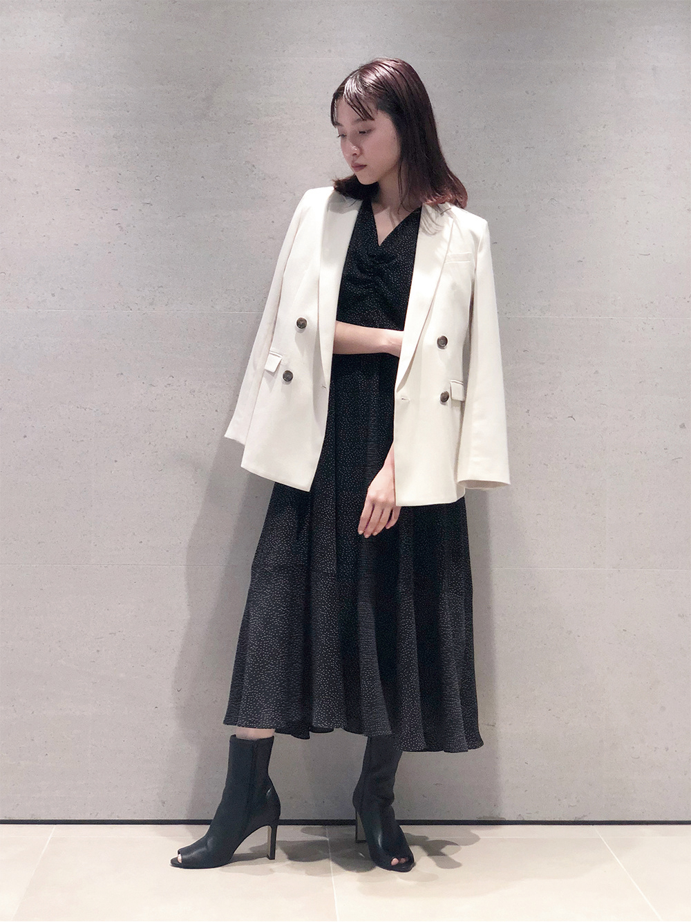 ブラックベースのドットワンピースに、ジャケットを合わせて洗練された着こなしに。色味を抑えて、甘すぎないコーディネートに仕上げました。